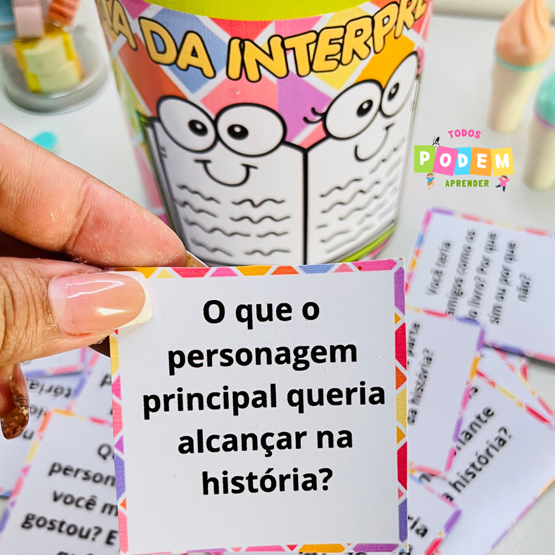 Dentro dela, você encontra cartões com perguntas e desafios que tornam a leitura muito mais interessante. Questões como “O que o personagem principal queria alcançar na história?” estimulam o pensamento crítico e ajudam na compreensão.